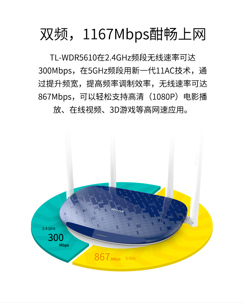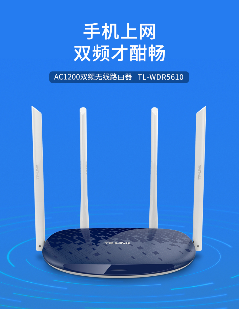 • 商品名称:TP-LINK TL-WDR5610宝蓝 1200M 5G双频智能无线路由器 四天线智能wifi 稳定穿墙高速
