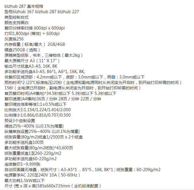 • 商品名称:柯尼卡美能达bizhub 287复印机