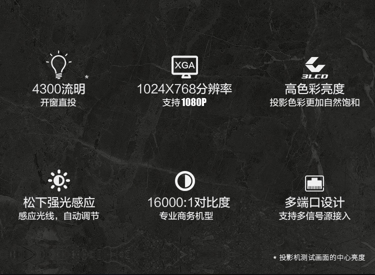 标准亮度≥4100流明(4300流明中心亮度);对比度≥16000:1;标准分辨率1024*768(XGA),兼容16:10,16:9;手动1.2倍变焦,投射比:1.48-1.78:1;灯泡寿命≥10000小时,节能模式下寿命≥20000小时;机器重量≥3.0KG;