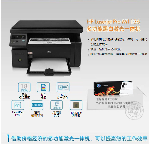 • 商品名称:惠普(HP)M1136 多功能三合一黑白激光一体机