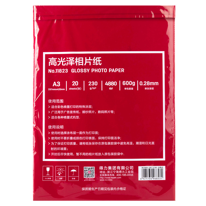 • 商品名称:得力(deli) 230gA3高光相片纸/照片纸 11823 20张/包